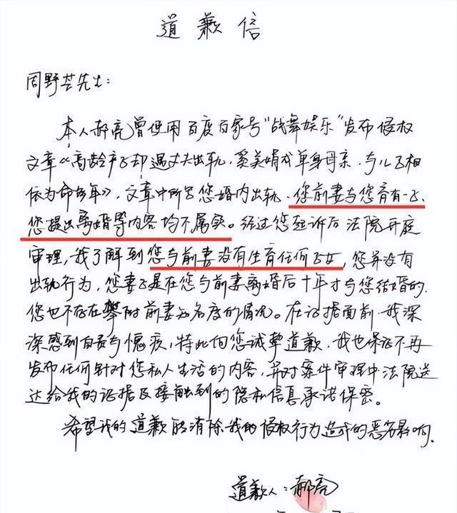 一个博主又把“周野芒抛妻弃子”的老梗翻出来做视频,周野芒这次没忍,直接把人告上法庭。庭审一开,博主当场认错, 道歉信里写得明明白白:周野芒和奚美娟没有孩子,婚内也没出轨 。全网哗然。三十年谣言,一封信打破。 原来一直被骂的那个人,什么都没做。