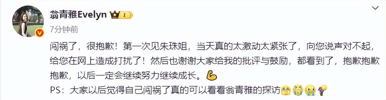 曾参加过《心动的信号》的女嘉宾翁青雅采访朱珠的一段视频引发热议,不少网友吐槽翁青雅没礼貌、业务能力差。2日,翁青雅在社交平台上发文向朱珠道歉:“闯祸了,很抱歉!第一次见朱珠姐,当天真的太激动太紧张了,向您说声对不起,给您在网上造成打扰了!然后也谢谢大家给我的批评与鼓励,都看到了,抱歉抱歉抱歉,以后一定会继续努力继续成长。PS:大家以后觉得自己闯祸了真的可以看看翁青雅的探访。”