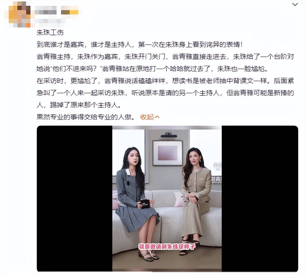 此前,翁青雅跨界主持采访朱珠,当天,她率先进门留采访嘉宾朱珠在身后关门,被吐槽礼仪太差,随后,在采访过程中,翁青雅不仅说话磕磕绊绊,还频频停顿忘词,被吐槽业务能力太差,不像提前做好准备工作的样子。
